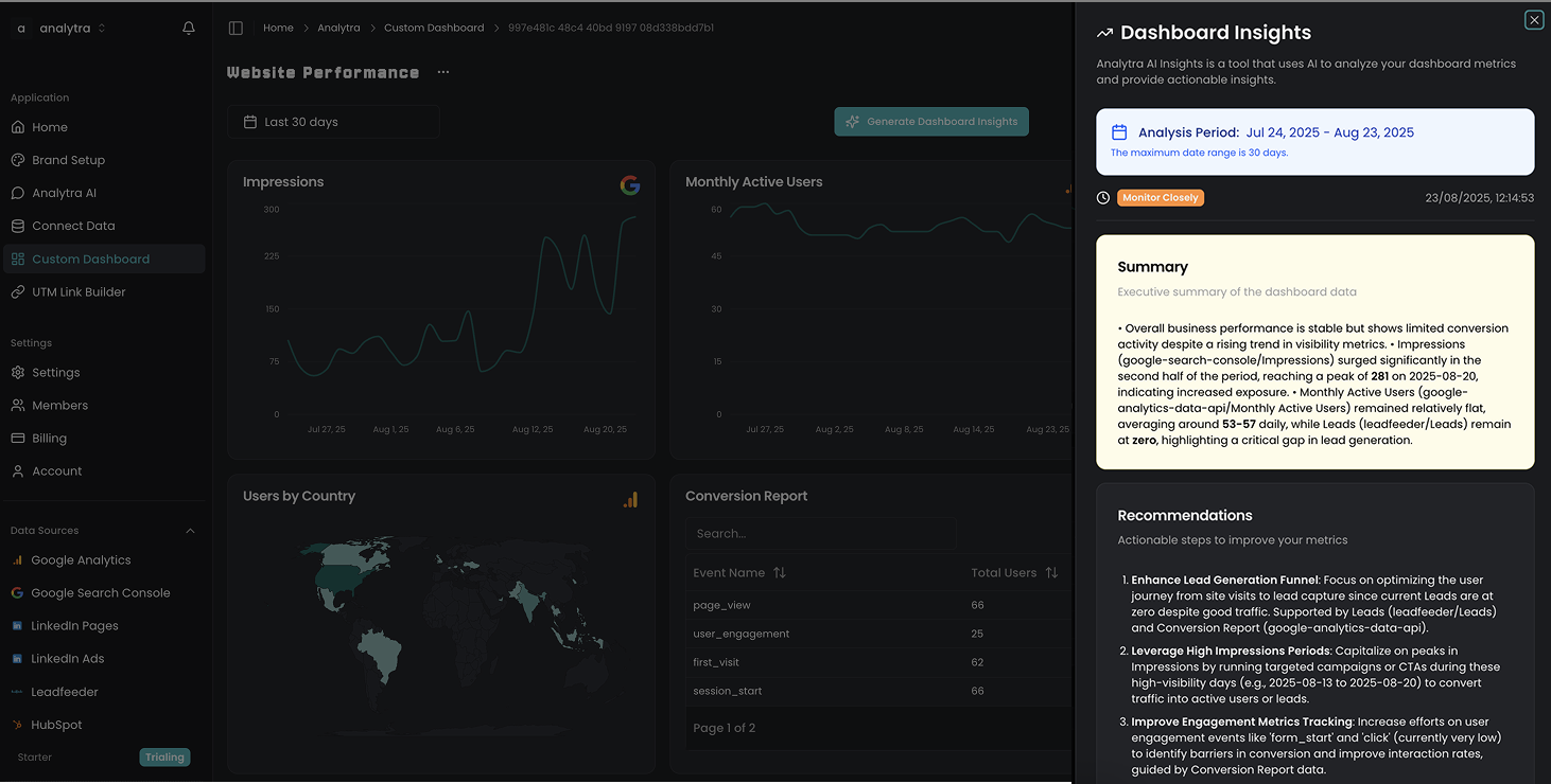 Our Dashboard Insights transform your metrics into clear, actionable intelligence. By analyzing your dashboard data, it delivers concise summaries, valuable insights, and smart recommendations—helping you quickly understand performance and make informed decisions.